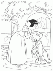 Si dirige quindi alla casetta dei nani e, approfittando della loro assenza (in quel momento al lavoro in miniera) convince Biancaneve a farla entrare in casa. L'ingenua ragazza accoglie l'anziana che, fingendosi grata per la gentilezza rivoltale, le offre la mela avvelenata invitandola ad assaggiare il frutto e raccontandole che se avesse espresso un desiderio e poi morso la mela, il desiderio si sarebbe avverato. Convinta da quelle parole, Biancaneve morde la mela ma, subito dopo, cade in un sonno eterno.